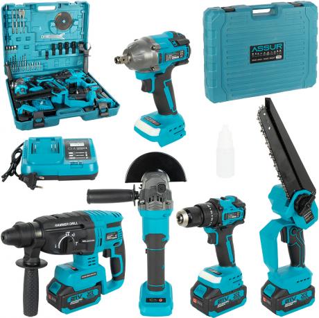 Багатофункціональний акумуляторний набір інструментів призначений для будівельних, ремонтних і садових робіт. До комплекту входить безщітковий дриль з металевим патроном 10 мм, акумуляторний гайковерт із крутним моментом до 350 Н·м, кутова шліфмашина діаметром 125 мм, а також акумуляторна ланцюгова пила з шиною 8 дюймів. Набір доповнений перфоратором з комплектом із 5 аксесуарів для свердління та ударних робіт.