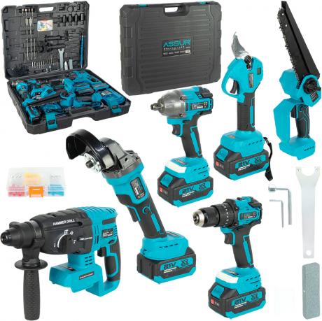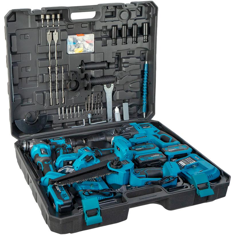 Професійний акумуляторний набір інструментів призначений для інтенсивних будівельних, монтажних і садових робіт. До комплекту входить безщіткова дриль з металевим патроном діаметром 10 мм, акумуляторний гайковерт із крутним моментом до 350 Н·м та кутова шліфувальна машина з диском діаметром 125 мм.