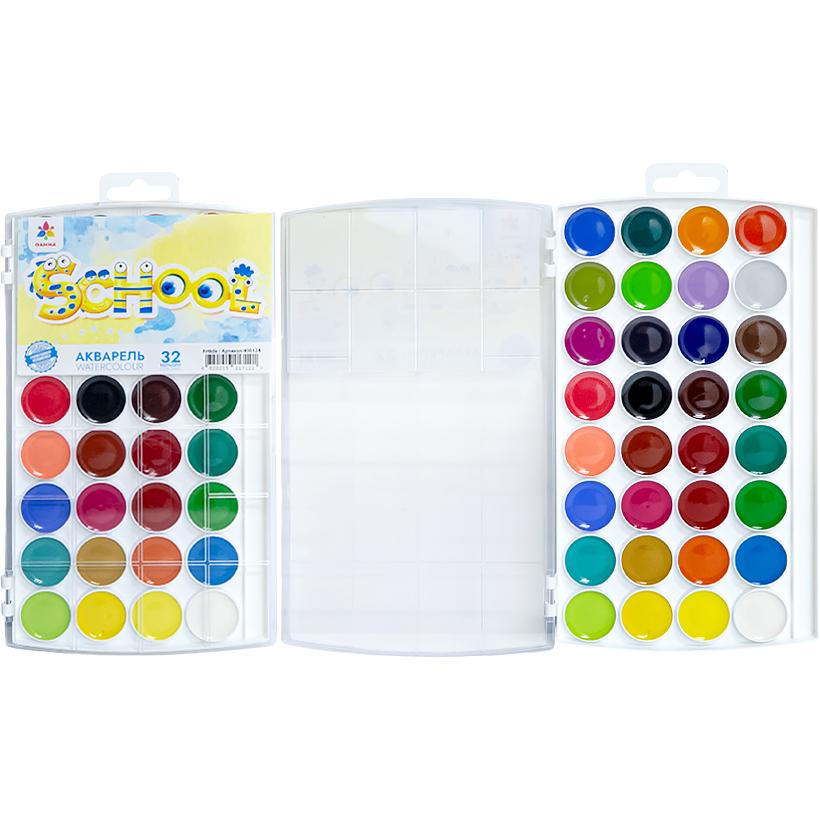 Акварель з 32 кольорами, медова, в пластиковій упаковці. Розмір упаковки 24 х 14 см. Використовується для дитячої творчості, художніх, оформлювальних та декоративно-прикладних робіт.