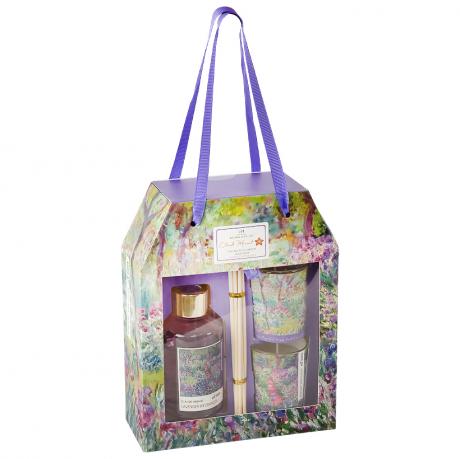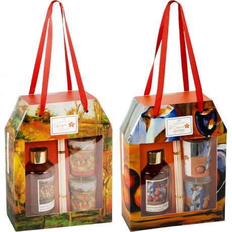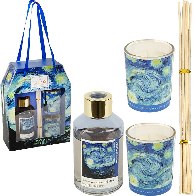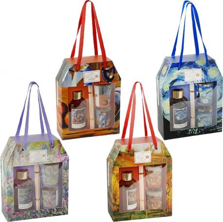 Подарунковий набір містить аромадифузор вагою 230 г із 6 паличками довжиною по 18 см та дві свічки по 125 г у скляних склянках з художнім принтом. Розмір коробки — 21×16×11×6 см. Дизайн коробки та склянок виконаний із зображеннями картин відомих художників, що надає набору особливої естетики.
