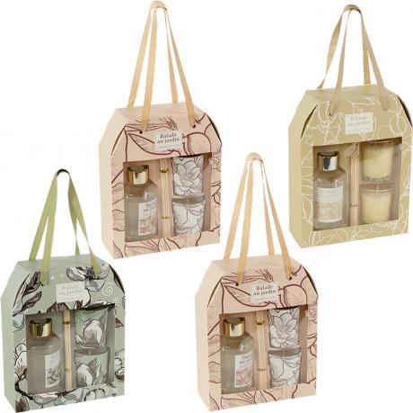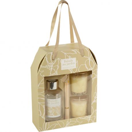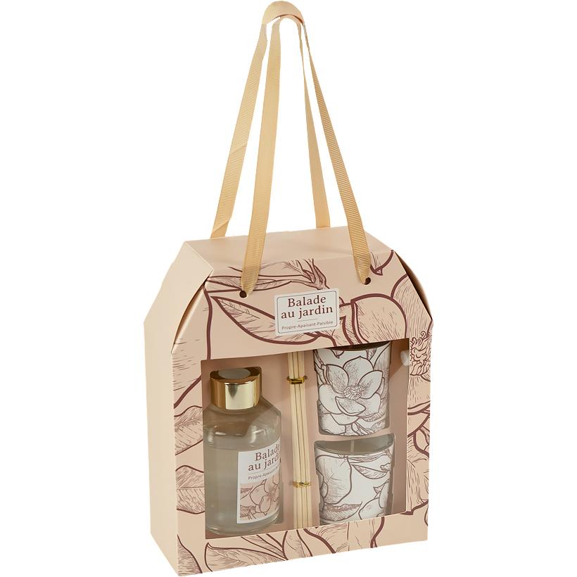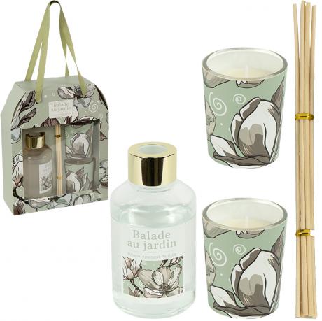 Подарунковий набір містить аромадифузор вагою 230 г із 6-ма паличками довжиною по 18 см та дві свічки по 125 г у скляних стаканах з ніжним квітковим принтом. Комплект постачається у коробці розміром 21×16×11×6 см. Свічки гармонійно доповнюють аромат дифузора, створюючи єдине звучання.