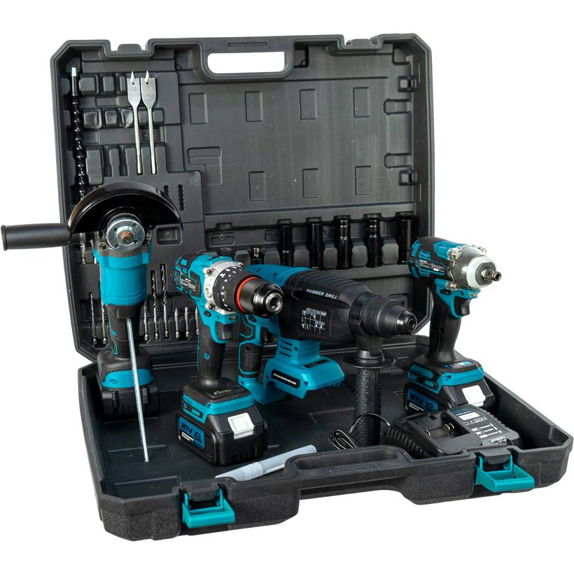 Акумуляторний набір 4-в-1 поєднує чотири безщіткові інструменти: електричний гайковерт із крутним моментом 300 Нм, кутову шліфувальну машину 125 мм, перфоратор 26 мм та ударний дриль 13 мм. Комплект призначений для будівельних, монтажних і ремонтних робіт — свердління, довбання, різання, шліфування та роботи з кріпленням.