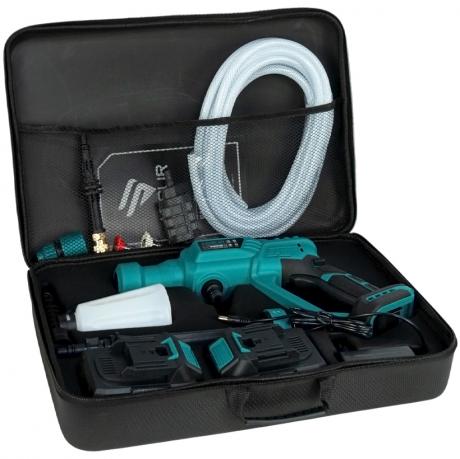 Акумуляторна автомобільна мийка призначена для швидкого та зручного очищення автомобілів, мотоциклів, садової техніки, фасадів, доріжок та інших поверхонь. Працює від літій-іонної акумуляторної системи з номінальною напругою 21V, забезпечуючи повну мобільність без підключення до електромережі або стаціонарного водопостачання. Оснащена акумуляторами ємністю 2000 mAh класу 5C для стабільної та продуктивної роботи. У комплект входять два акумулятори та мережевий зарядний пристрій. Повний набір аксесуарів, включно зі шлангом і насадками, дозволяє легко виконувати різні завдання з очищення. Ергономічна ручка та міцний корпус забезпечують комфорт і надійність у використанні. Для зберігання та транспортування передбачена зручна сумка.