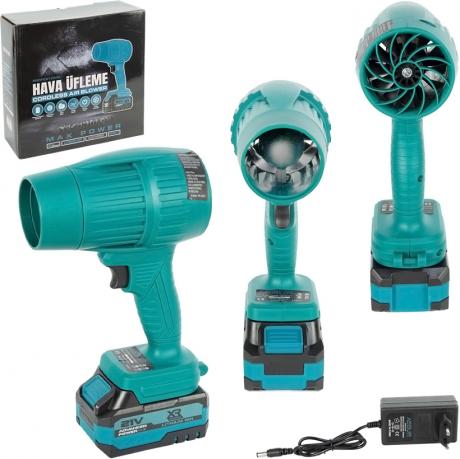 Акумуляторний турбовентилятор призначений для ефективного очищення робочих зон, видування пилу, тирси, листя та сміття в майстерні, гаражі, на будівництві або подвір’ї. Працює від акумуляторної системи з номінальною напругою 21V, забезпечуючи мобільність і стабільну потужність без підключення до електромережі. У комплекті передбачено два літій-іонні акумулятори ємністю 3000 mAh класу 5C з подвійним рядом із 10 елементів, що гарантує тривалий час роботи та надійну продуктивність. Ергономічна ручка забезпечує зручне та безпечне користування. Заряджання здійснюється за допомогою мережевого зарядного пристрою, який входить до комплекту. Підходить для побутового та професійного застосування.