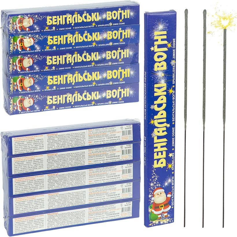 Бенгальські вогні - це піротехнічні вироби розважального характеру, що створюють ефект розлітаючихся блискучих іскор. Вони яскраво і стабільно горять. Ці вогні можуть використовуватися для прикраси різних святкових заходів, таких як дні народження, весілля або новорічні свята. Кожна бенгальська свічка має довжину 25 см. В одній упаковці знаходиться 30 коробочок, в кожній з яких по 10 штук.