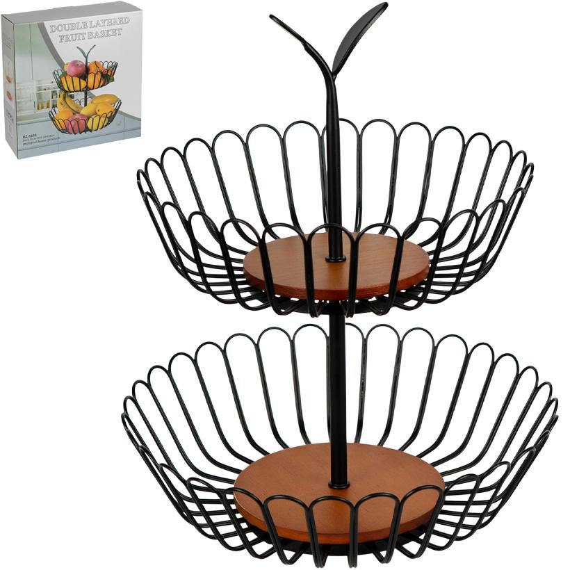 Дворівнева металева фруктівниця — стильне та практичне рішення для зберігання фруктів, солодощів або випічки. Міцна металева конструкція забезпечує стійкість, а дерев’яні основи додають виробу декоративності та захищають поверхню столу. Два рівні дозволяють зручно розміщувати продукти та економити простір.