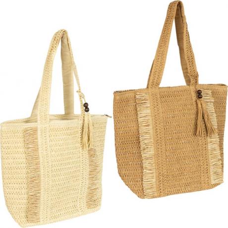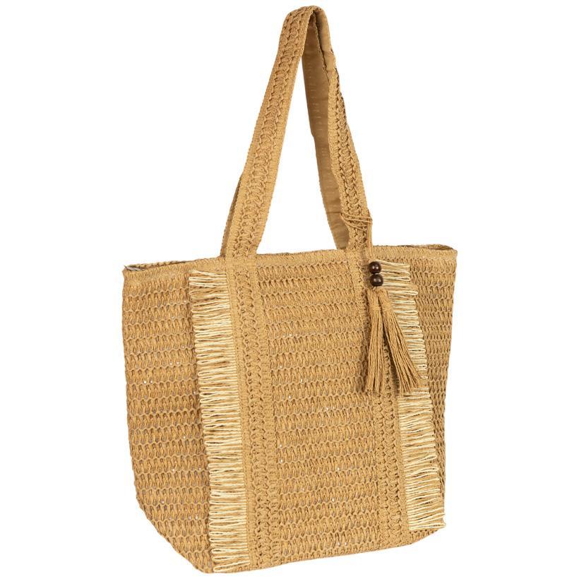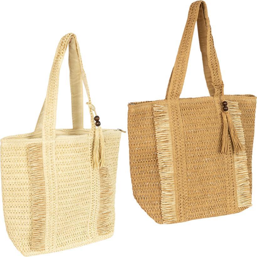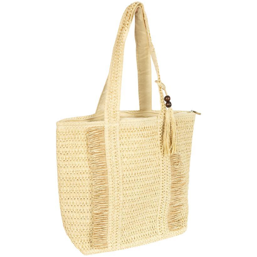 Вишукана плетена сумка на блискавці з бахромою — чудовий аксесуар для літа. Розмір 46×36×15 см дозволяє зручно розмістити все необхідне: рушник, косметичку, документи. Модель виготовлена з легкого та міцного матеріалу, прикрашена стильною китичкою з дерев’яними намистинами. Застібається на блискавку, всередині — просторе відділення й маленька кишенька для дрібниць. Широкі ручки зручні для носіння на плечі. Ідеальний варіант для пляжу, міських прогулянок і подорожей. Рекомендовано для магазинів одягу, аксесуарів і подарунків.