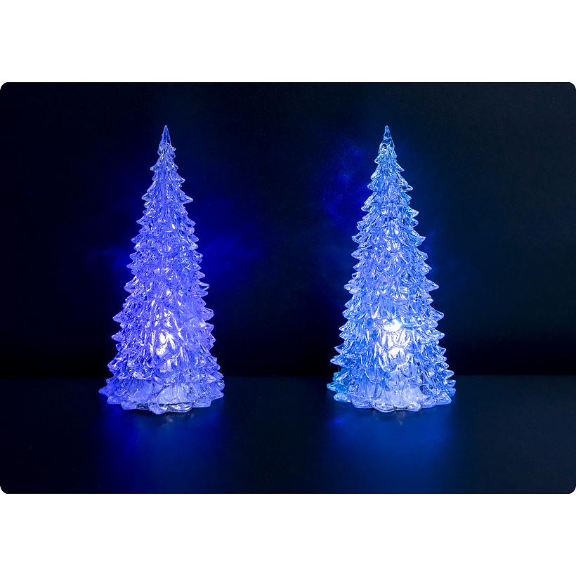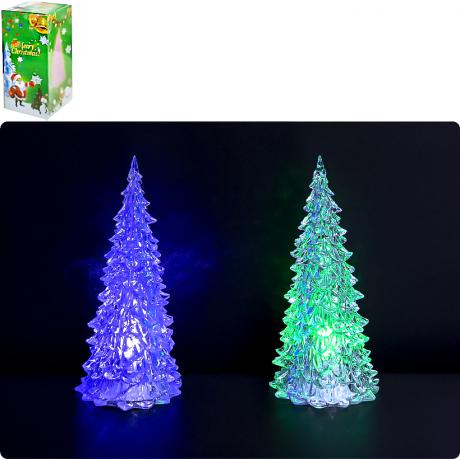 Ця світлодіодна ялинка моделі CX-1 виготовлена з прозорого пластику зеленого кольору. Вона має вбудоване світлодіодне підсвічування, яке переливається всіма кольорами веселки. Висота ялинки становить 17 см, а діаметр - 7 см. Ялинка працює від трьох батарейок типу G10. Вона поставляється в картонній коробці.