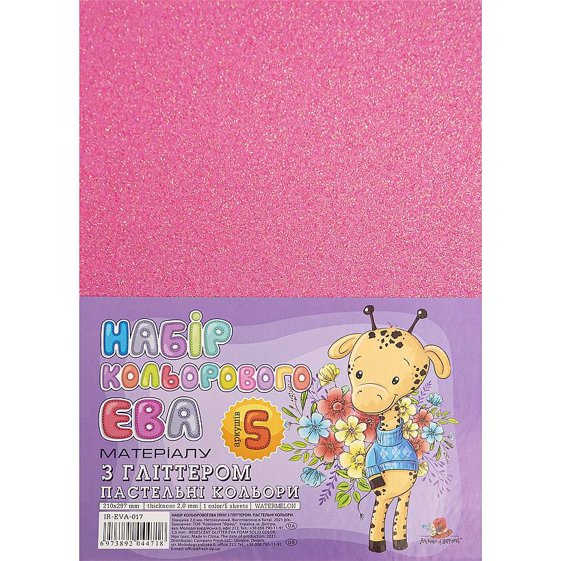 Набір кольорового матеріалу EVA з глітером, 5 аркушів формату 210×297 мм, товщиною 2 мм. Аркуші гнучкі та міцні, легко ріжуться й підходять для будь-яких видів рукоділля, аплік ...