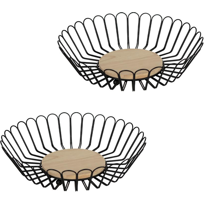 Металева фруктівниця-кошик — практичний аксесуар для кухні або їдальні. Відкрита конструкція забезпечує добру циркуляцію повітря та сприяє довшому збереженню свіжості фруктів. Основа доповнена декоративним дерев’яним кругом, який надає виробу охайного вигляду та захищає поверхню столу. Підходить для фруктів, овочів, солодощів або випічки.