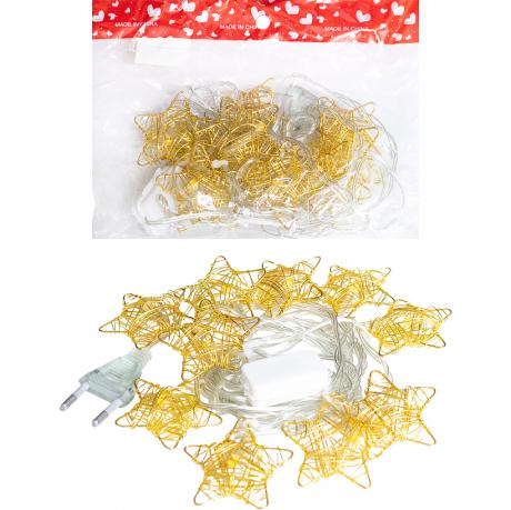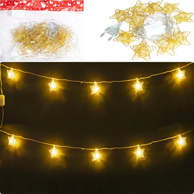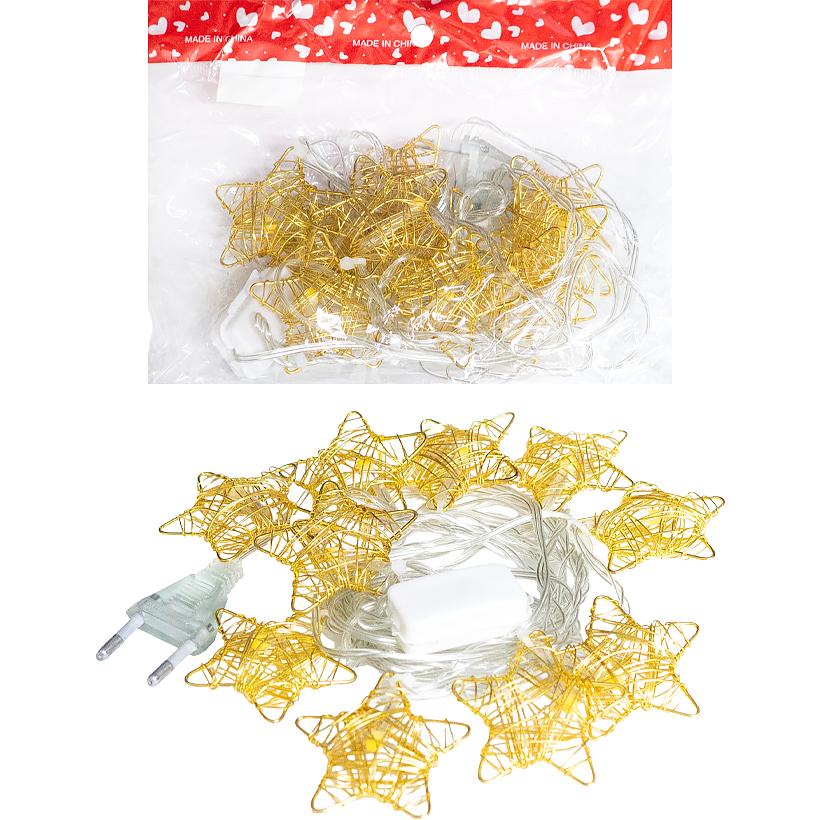 Електрична гірлянда з 10 світлодіодами у формі зірок. Світіння ламп тепле жовте. Декоративний елемент виготовлений з металу, розміром 5x5 см. Дріт прозорий. Працює від мережі 220V. Призначена для використання в приміщеннях. Загальна довжина гірлянди – 2 метри.
