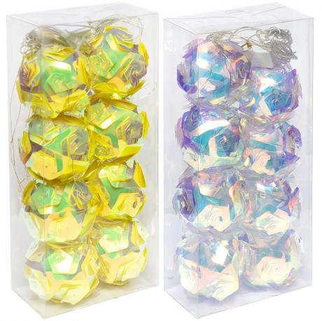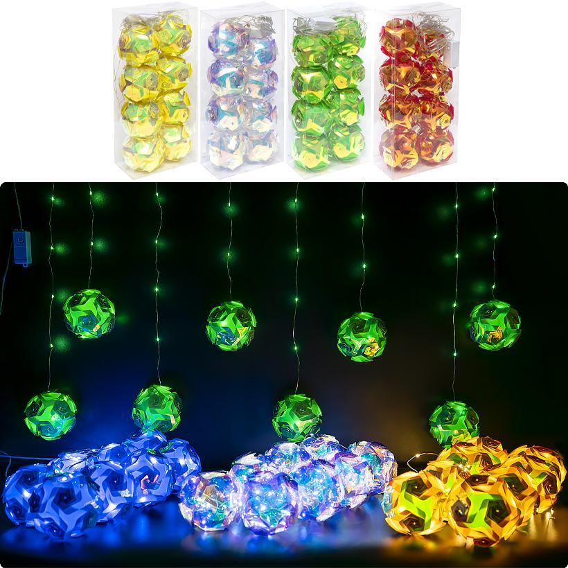 Електрична гірлянда складається з 8 кольорових куль діаметром 9 см. Світло має теплий білий колір з 8 режимами роботи. Довжина шнура становить 3 метри, з яких нитки звисають на 60 см і 35 см. Загальна довжина гірлянди - 3,5 метра. Дріт прозорий, живлення 220V. Розмір упаковки: 39 x 18 x 9,5 см.