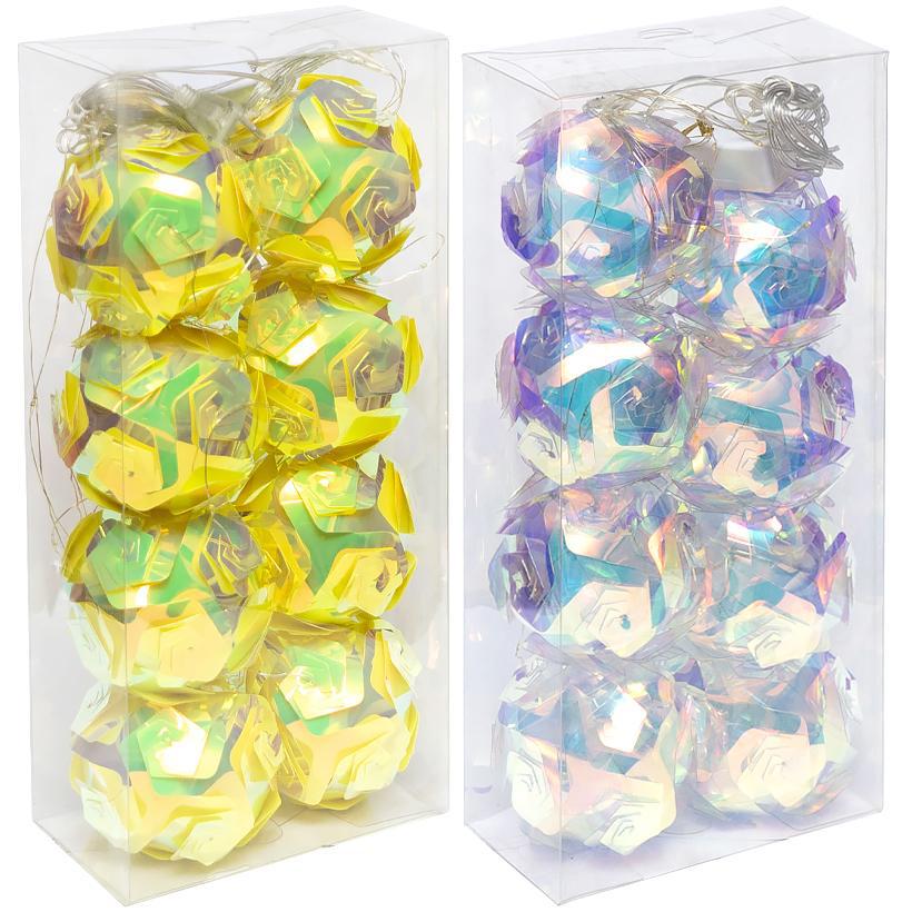 Електрична гірлянда з 20 світлодіодами створює різнобарвне освітлення. Довжина гірлянди становить 5 метрів. Лампи світять в режимі мерехтіння. Дріт прозорий, живлення 220V. При ...
