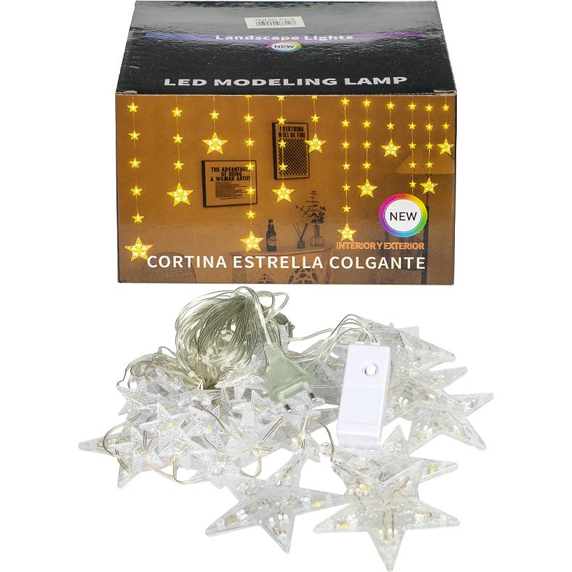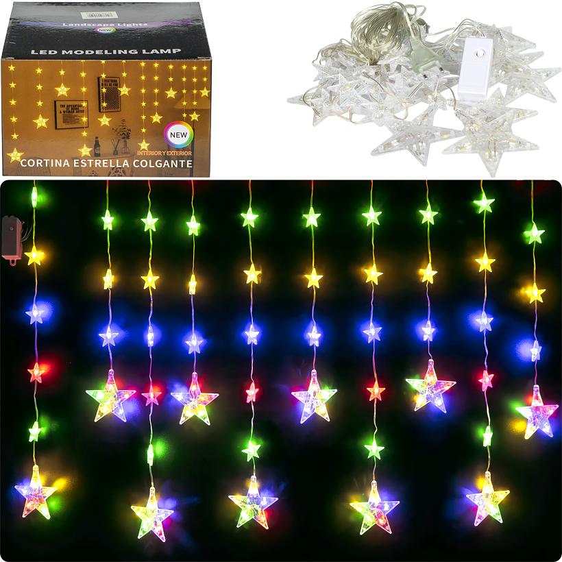 Електрична гірлянда з різнобарвними мікролампочками підходить для декорування інтер'єру. Мініконтролер має 8 програм для вибору режимів світіння. Лампи світять у червоному, зеленому, синьому та жовтому кольорах. Довжина основи шнура – 3 м, з якого звисають 10 великих зірок (10 см) та 50 малих зірок (3,5 см). Загальна довжина гірлянди – 3,5 м. Харчування – 220V. Розмір упаковки: 16*15*10 см.
