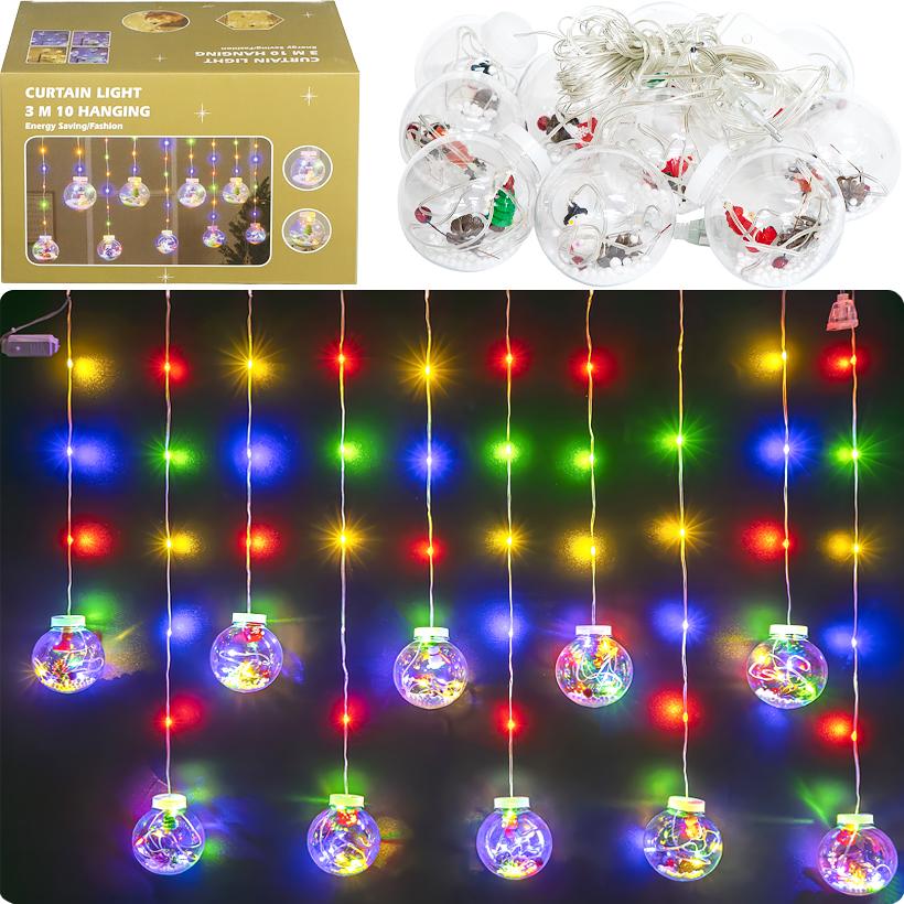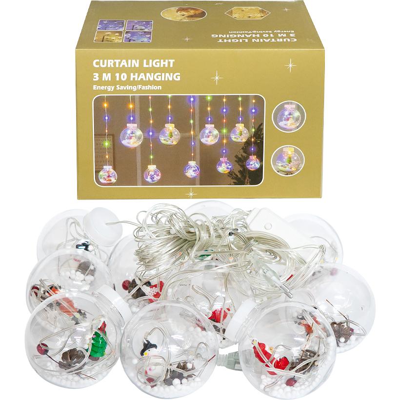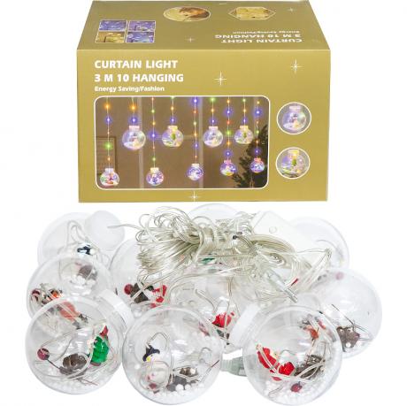 Електрична гірлянда з 10 мікролампами різних кольорів. Має 8 режимів світіння. Дріт прозорий, живлення 220V. Довжина основи шнура 3 м, загальна довжина 4 м. Довжина звисаючих ниток від 50 до 75 см. Є роз'єм для подовження. Розмір упаковки: 23,5 x 16 x 16,5 см.