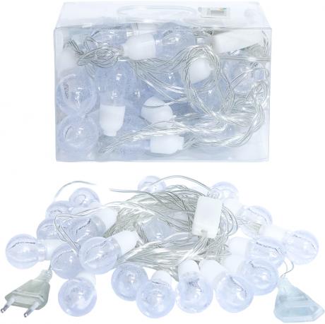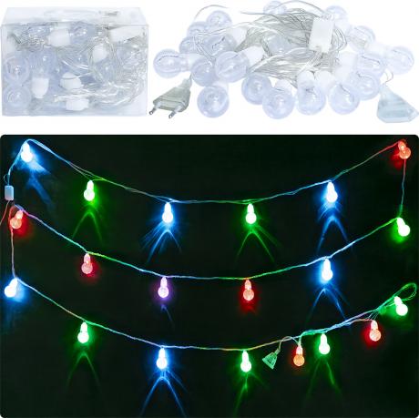 Електрична гірлянда з 20 світлодіодами створює різнобарвне освітлення. Довжина гірлянди становить 5 метрів. Лампи світять в режимі мерехтіння. Дріт прозорий, живлення 220V. Призначена для використання в приміщеннях. Є роз'єм для підключення додаткових гірлянд.
