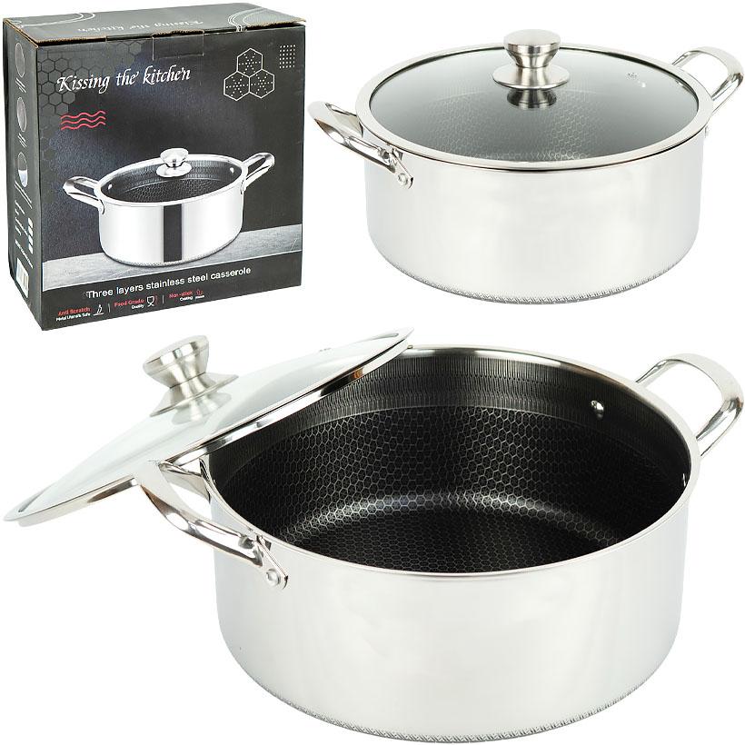 Каструля з нержавіючої сталі з антипригарним покриттям, 32 см — надійна та зручна помічниця на вашій кухні. Виготовлена з високоякісної харчової нержавіючої сталі марок 304 і 430, вона має товсті стінки та сучасну 6-шарову систему покриття. Внутрішня поверхня з сотоподібною текстурою (Honeycomb pattern) не лише запобігає пригоранню, а й полегшує очищення після приготування.