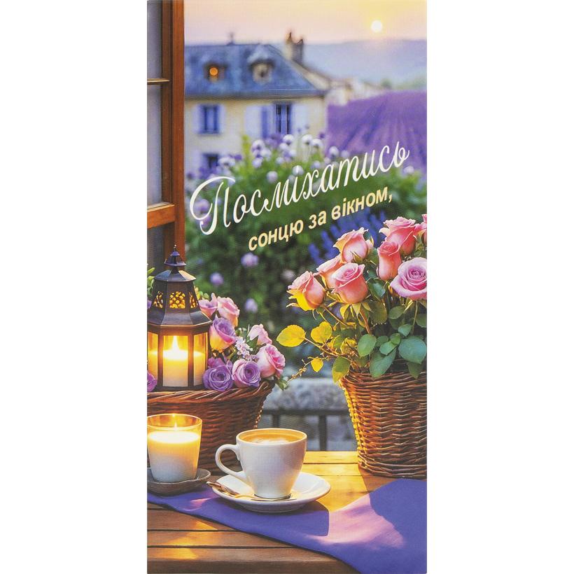 Конверт для грошей призначений для оформлення грошового подарунка до будь-якого свята та стане зручним способом його вручення. Розмір — 16,5×8 см, матеріал — картон. На лицьовій стороні розміщена фраза «Посміхатись сонцю за вікном» на тематичному малюнку, на звороті — слова «В День народження помічати, що життя прекрасне!». Конверт без тексту всередині та без додаткових внутрішніх кишеньок, купюра розміщується в основному відділенні. Упаковка — 10 шт, ціна вказана за 1 одиницю товару. Товар вигідний для оптових магазинів і підходить для роздрібного продажу.