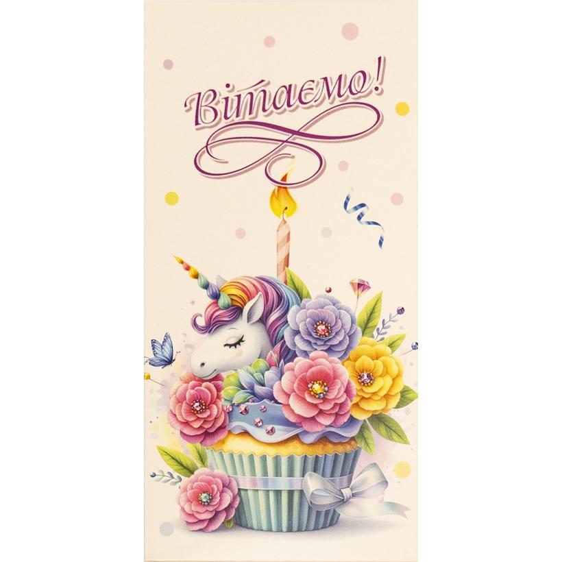 Конверт для грошей призначений для оформлення грошового подарунка до будь-якого свята та стане зручним способом його вручення. Розмір — 16,5×8 см, матеріал — картон. На лицьовій стороні розміщена фраза «Вітаємо» на тематичному малюнку, на звороті — фраза «Хай життя буде кольоровим, як веселка, і смачним, як улюблене тістечко!». Конверт без тексту всередині та без додаткових внутрішніх кишеньок, купюра розміщується в основному відділенні. Упаковка — 10 шт, ціна вказана за 1 одиницю товару. Товар вигідний для оптових магазинів і підходить для роздрібного продажу.