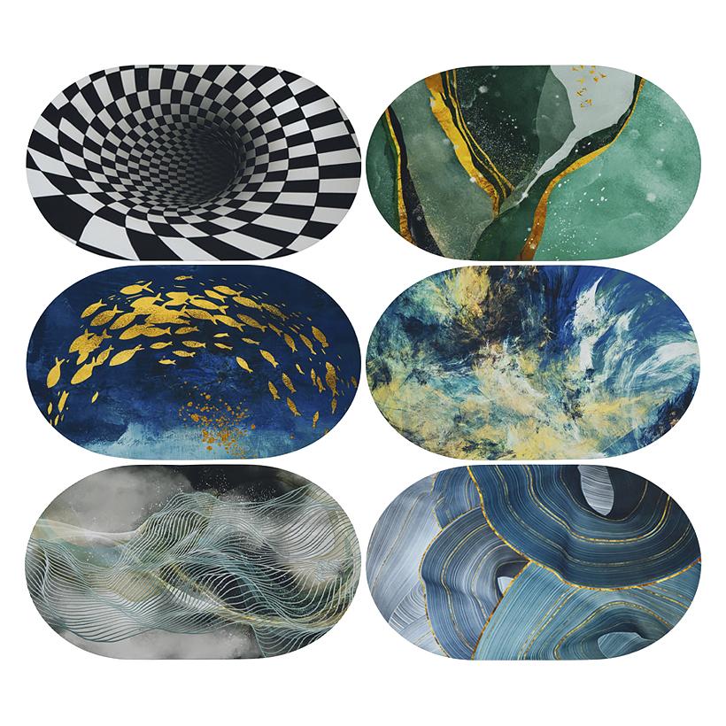 Овальний килимок 2901-20 розміром 38×58 см підходить для ванної кімнати, передпокою або кухні. Верхній шар з візерунком добре вбирає вологу та допомагає затримувати бруд. Нижня сторона повністю гумова, що забезпечує стійкість і запобігає ковзанню. Килимок зручний у догляді та підходить для щоденного використання.