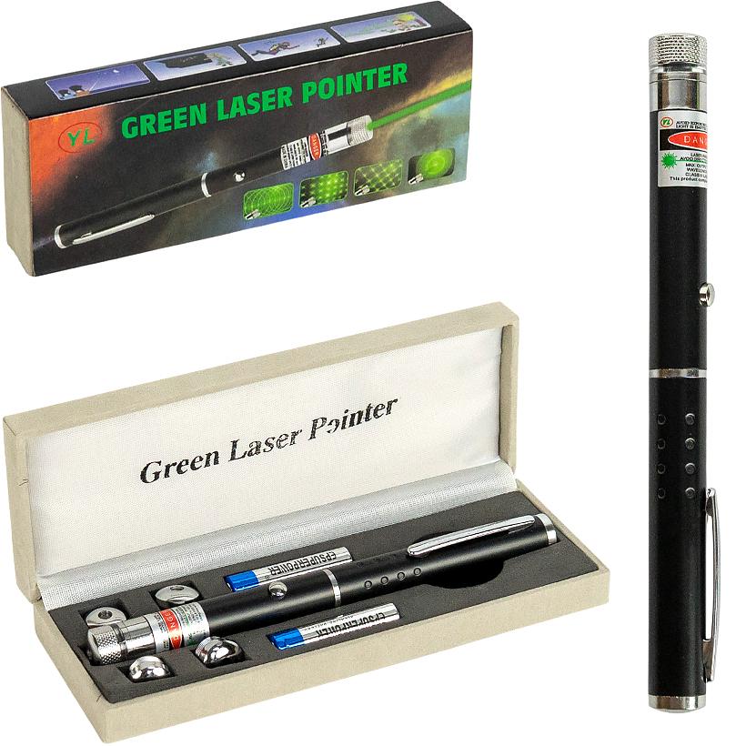 Зелена лазерна указка 5 в1 — це портативний пристрій, який випромінює вузьконаправлений промінь, видимий у темряві, сутінках або тумані. Вона відрізняється від червоних лазерів тим, що промінь видно не тільки на об'єкті, але й протягом всього свого шляху. Указка має 5 насадок для створення різних світлових візерунків. Цей пристрій можна використовувати для презентацій, лазерних шоу або вказування на об'єкти на відстані. Живиться від двох батарейок типу ААА, які входять у комплект. Довжина указки становить 16,5 см.