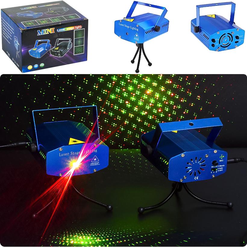 Лазерний проектор створює світлові ефекти для вечірок, клубів або домашніх заходів. Має два режими роботи: фоновий та в такт музиці. Пропонує різноманітні малюнки з регулюванням швидкості зміни. Кольори променів: зелений і червоний. У комплекті тренога для установки та скоба для підвішування. Живлення 110-220В, вага 175 г, розміри 10,5 x 9,5 x 5 см, довжина шнура адаптера 80 см.