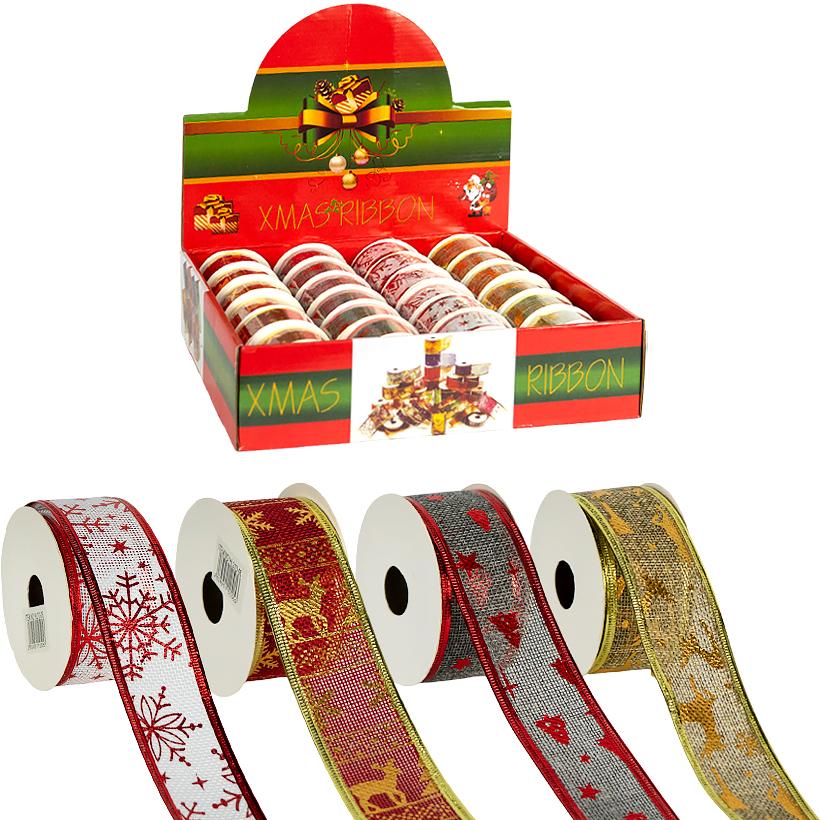 Декоративна стрічка з дротяним краєм та новорічним малюнком. Використовується для оформлення приміщень, виготовлення ялинкових іграшок, упаковки новорічних подарунків, а також для створення заколок і бантиків. Ширина стрічки 4 см, довжина 2,7 м. У упаковці 24 шт.