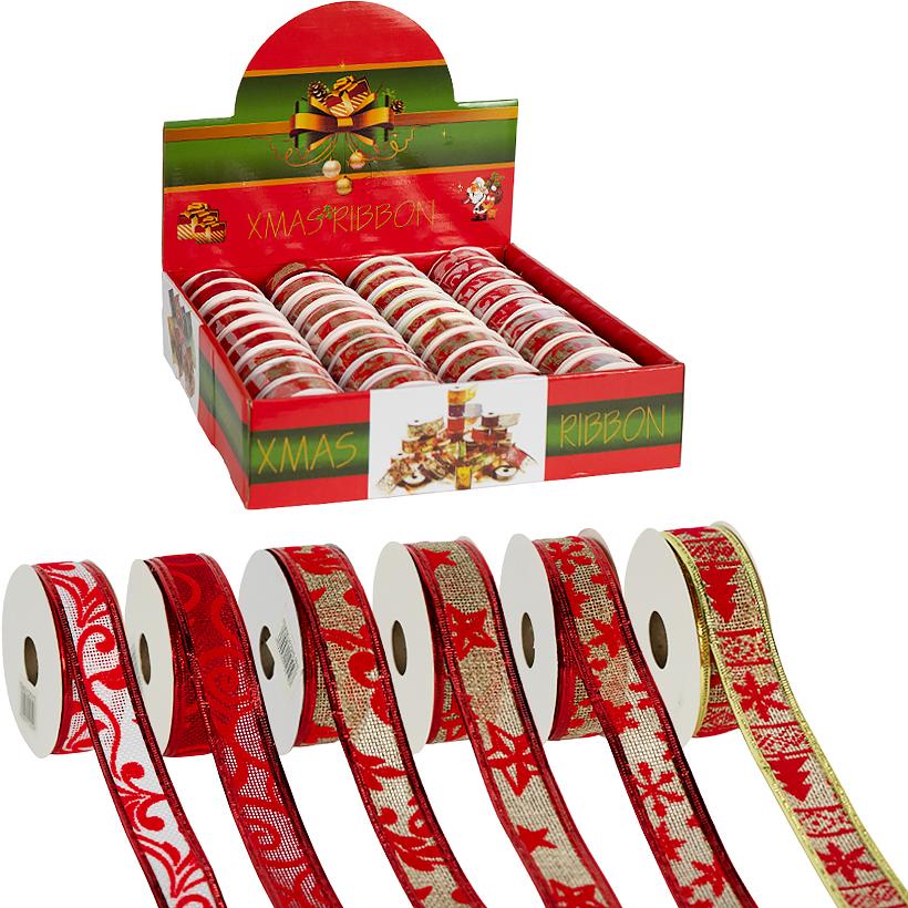 Декоративна стрічка з дротяним краєм та новорічним малюнком. Використовується для оформлення приміщень, виготовлення ялинкових іграшок, упаковки новорічних подарунків, а також для створення заколок і бантиків. Ширина стрічки 2,5 см, довжина 2,70 м. У упаковці 36 штук.