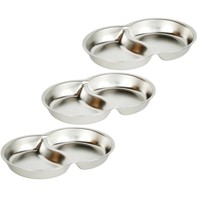 Тарілка для приправ металева подвійна 13×8,5 см, об’єм кожної секції приблизно 40 мл (632-2). Виготовлена з міцної нержавіючої сталі, стійка до зношування та впливу вологи. Підходить для подачі соусів, приправ, спецій чи дрібних закусок. Компактна та зручна у використанні як вдома, так і в закладах громадського харчування.