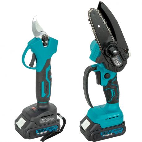 Набір акумуляторних садових інструментів 2-в-1 призначений для догляду за деревами, кущами та декоративними рослинами. До комплекту входять бездротова міні-ланцюгова пила та акумуляторний секатор, що дозволяє виконувати як обрізку гілок, так і точні садові роботи. Ланцюгова пила оснащена направляючою шиною розміром 4" і 6", що забезпечує зручність роботи навіть у важкодоступних місцях. Секатор розрахований на обрізку гілок діаметром до 25 мм. Інструменти працюють від акумуляторної системи з напругою 18V. У комплект входять акумулятори ємністю 1500 mAh класу 5C, які забезпечують стабільну потужність і автономність. Набір ідеально підходить для саду, дачі та присадибної ділянки, поєднуючи мобільність, компактність і зручність у використанні.
