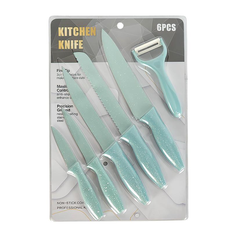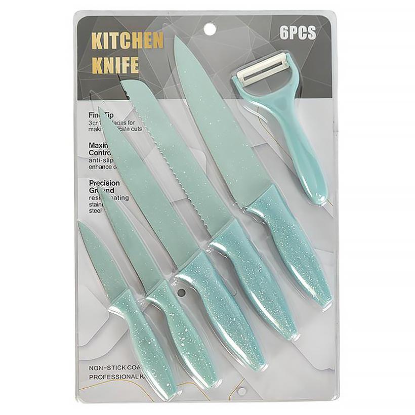 Зручний комплект для щоденного використання, що включає 5 ножів різних розмірів та овочечистку. Леза з нержавіючої сталі з антипригарним покриттям забезпечують легке та акуратне нарізання, а ергономічні ручки роблять роботу комфортною.