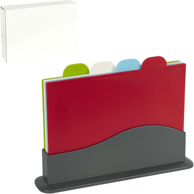 Набір обробних дошок з підставкою, 4 шт (арт. 9098) — компактний і зручний кухонний комплект, що допомагає підтримувати гігієну та порядок під час приготування їжі. Кожна дошка має свій колір і піктограму для різних продуктів, що запобігає змішуванню запахів і перехресному забрудненню: