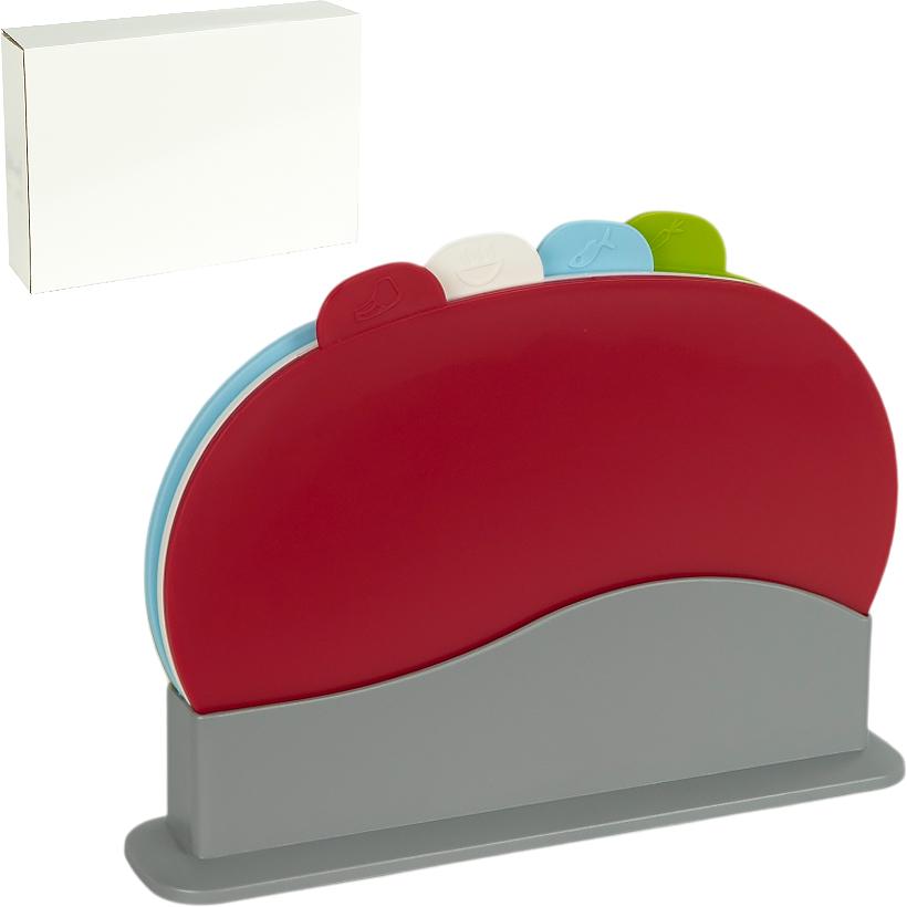 Набір обробних дошок з підставкою, 4 шт (розмір 30×20 см) — стильний і зручний комплект для кухні, що дозволяє готувати різні продукти гігієнічно та без змішування запахів. Кожна дошка має свій колір і піктограму: