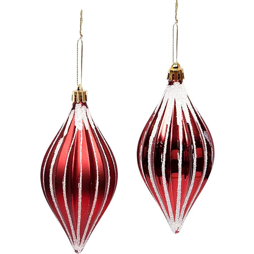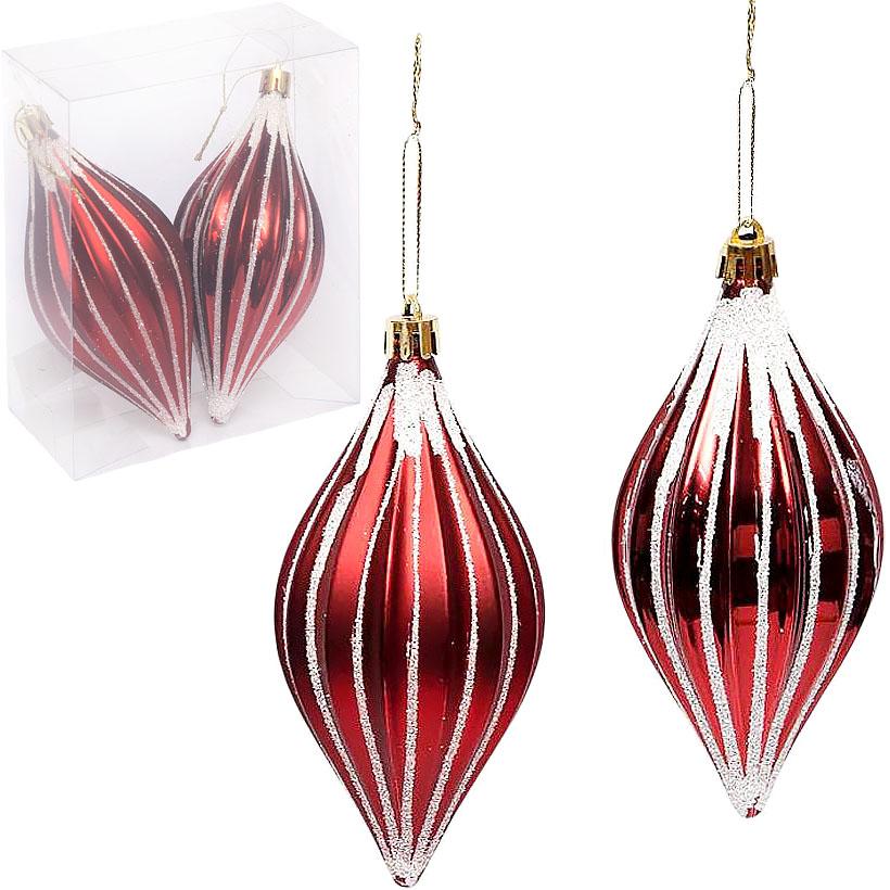 Набір ялинкових іграшок 2шт. Матеріал: пластик з глітером, колір глянцевий/матовий. Розмір іграшки: 13 * 6см. Упаковані у пластикову коробочку. Ціна вказана на набір 2шт.