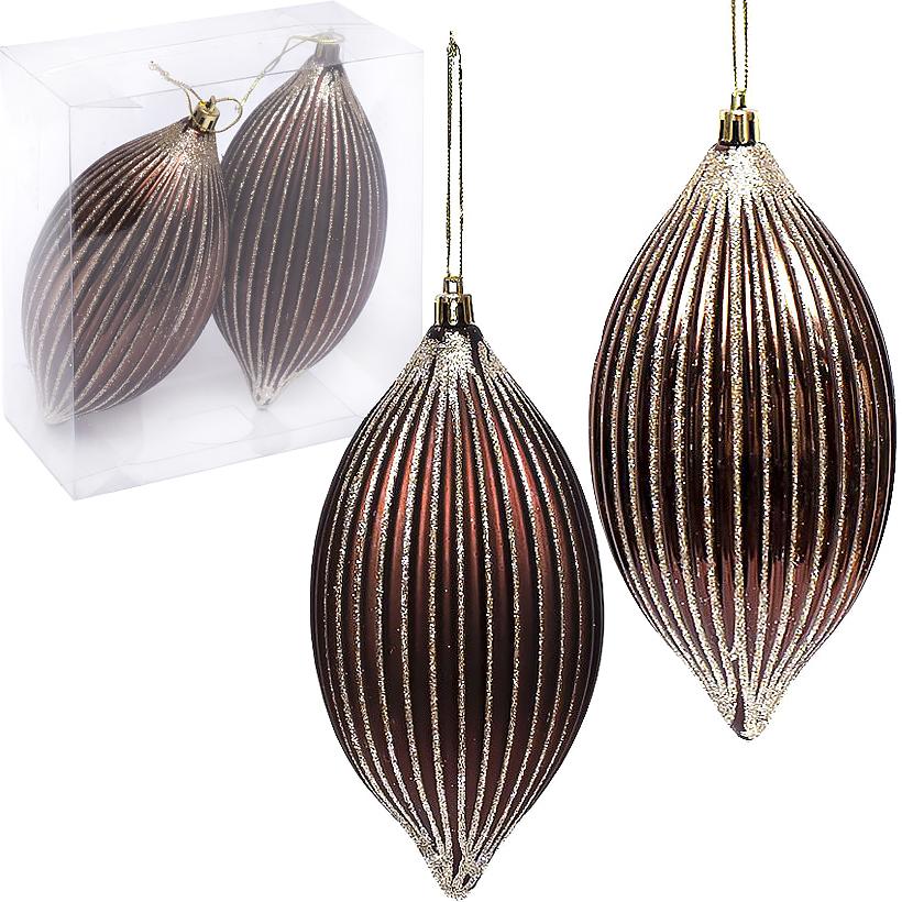 Набір ялинкових іграшок містить 2 шт. Матеріал виготовлення — пластик з глітером. Розмір кожної іграшки становить 16*8 см. Упаковка — пластиковий контейнер. Ціна вказана за набір з 2 штук.