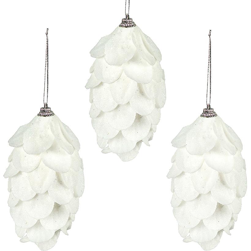 Набір ялинкових іграшок складається з трьох штук. Іграшки виготовлені з пінопласту та гліттера. Розмір кожної іграшки становить 11,5 см на 5,5 см. Упаковка виконана в пластиковій коробці розміром 17,5 см на 12 см на 6 см. Колір іграшок білий. Ціна вказана за набір з трьох штук.