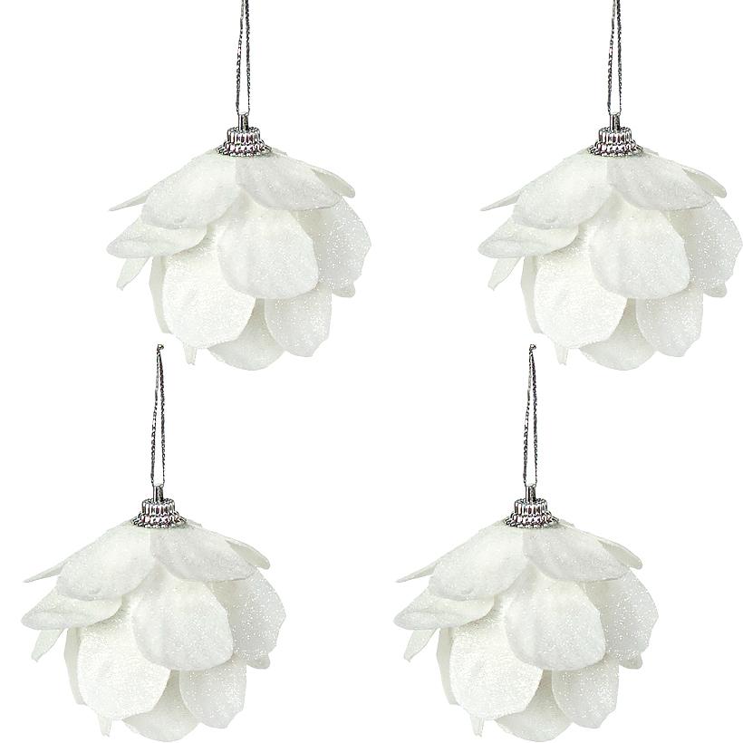 Набір містить чотири ялинкові іграшки у формі шишок. Матеріал виготовлення – пінопласт з гліттером. Розмір кожної іграшки становить 6*6 см. Упаковані в пластикову коробочку розміром 23*6*6 см. Колір білий. Ціна вказана за набір з чотирьох штук.