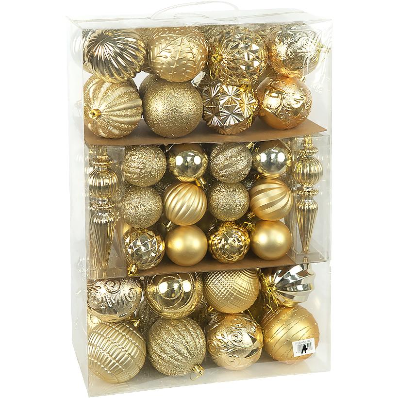 Набір ялинкових прикрас 6279-1G (74 шт.) — стильний комплект у благородному золотому кольорі. У наборі: 32 кулі діаметром 7 см, 36 куль діаметром 5 см та 6 видовжених прикрас довжиною 16 см. Поверхні мають різні фактури — матові, глянцеві, з блискітками та рельєфним орнаментом, що створює ефект глибини та святкової розкоші. Прикраси виготовлені з міцного, легкого пластику, безпечного для дітей і тварин. Упаковані у прозору коробку с рукой 48×32×16 см, зручну для зберігання або як подарунковий варіант. Ідеально підходять для декору ялинки, оселі, офісу чи вітрини.