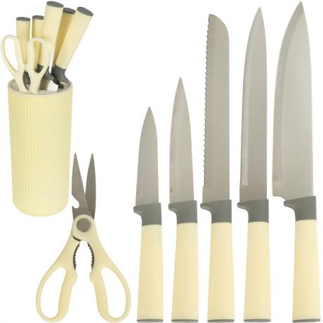 Набір кухонних ножів із підставкою — це практичний і стильний аксесуар для кухні. У комплект входять 7 предметів: 5 ножів різного розміру, універсальні ножиці та зручна циліндрична підставка з рифленою поверхнею.