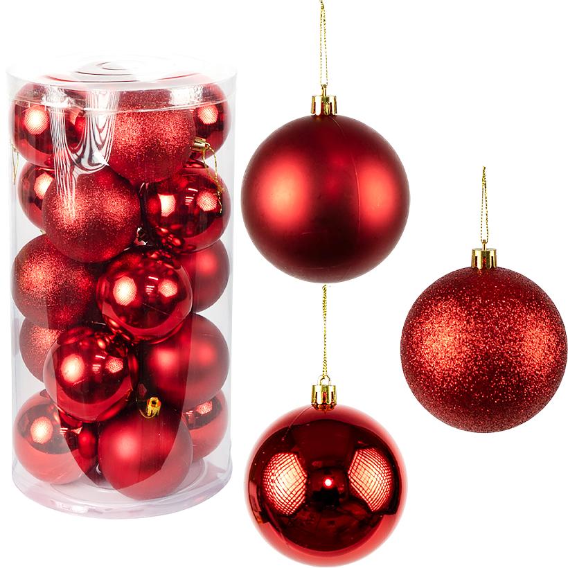Набір новорічних пластикових куль — стильна прикраса для святкової ялинки. У комплекті 20 куль діаметром 6 см: 10 глянцевих, 5 матових і 5 блискучих. Усі кулі виготовлені з міцного пластику, стійкого до ударів і безпечного для дітей та тварин. Різні фактури створюють виразний та гармонійний новорічний декор. Упаковка — тубус діаметром 14 см і висотою 25,5 см, зручна для зберігання або як подарункове оформлення.