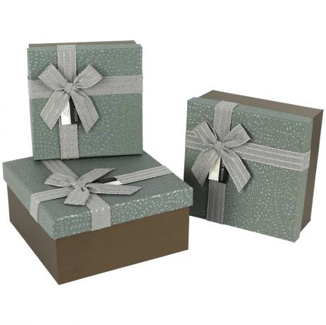 Набір подарункових коробок з принтом 3 шт. Розміри — 19.5х19.5х9,5 см, 17х17х8 см і 15х15х6,5 см. Коробки жорсткої конструкції, вкладаються одна в одну та додатково упаковані в плівку, що зручно для зберігання і транспортування. Кришки прикрашені тканинною святковою стрічкою, укладеною навхрест і доповненою бантом, що надає упаковці презентабельного вигляду. Підходять для оформлення подарунків і святкових наборів. Товар вигідний для оптових магазинів і підходить для роздрібного продажу.