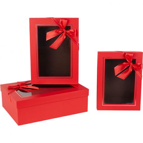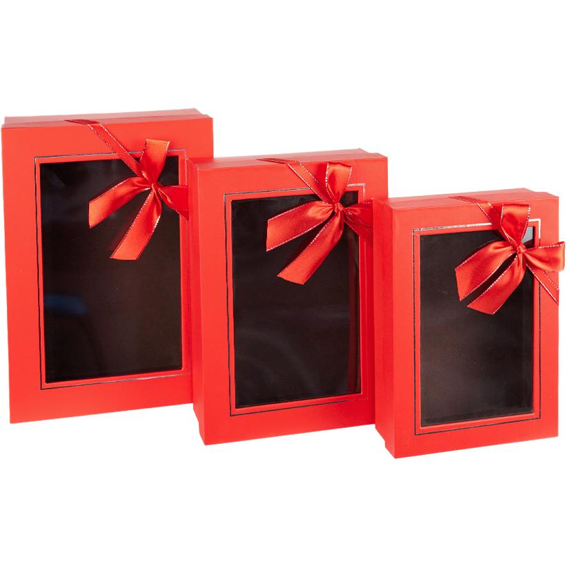 Набір подарункових коробок червоних 3 шт. Розміри — 29×21×9,5 см, 25,5×18,5×8 см і 22,5×16,5×6 см. Коробки жорсткої конструкції, вкладаються одна в одну та додатково упаковані в плівку, що зручно для зберігання і транспортування. Оформлені святковою стрічкою з бантом. Кришка оснащена прозорим віконцем із щільної плівки, виконаним у форматі фоторамки, що дозволяє бачити вміст і надає упаковці охайного вигляду. Підходять для подарунків і святкових наборів. Товар вигідний для оптових магазинів і підходить для роздрібного продажу.