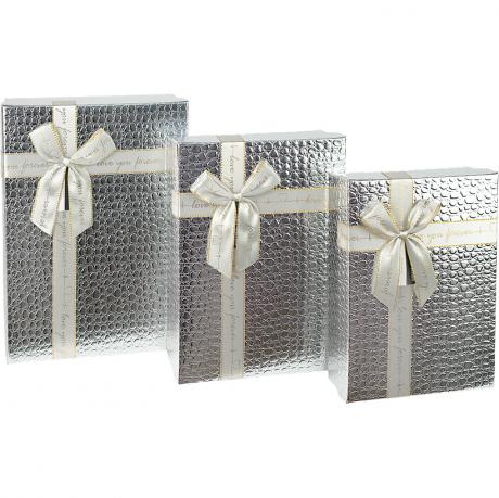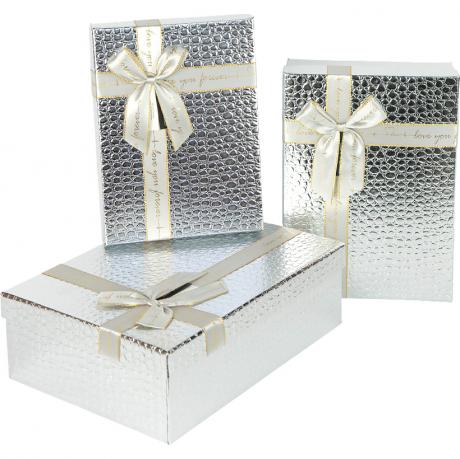 Набір подарункових коробок сріблястих 3 шт. Розміри — 29×21×9,5 см, 25,5×19,5×8 см і 22,5×16,5×6,5 см. Коробки жорсткої конструкції, добре тримають форму та підходять для презентаційної упаковки. Вкладаються одна в одну та додатково упаковані в плівку, що зручно для зберігання і транспортування. Поверхня має текстуру під рептилію, що надає виробам виразного та ефектного вигляду. Оформлені декоративною стрічкою, укладеною хрест-навхрест по бокових сторонах і доповненою акуратним бантом. Товар вигідний для оптових магазинів і підходить для роздрібного продажу.