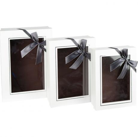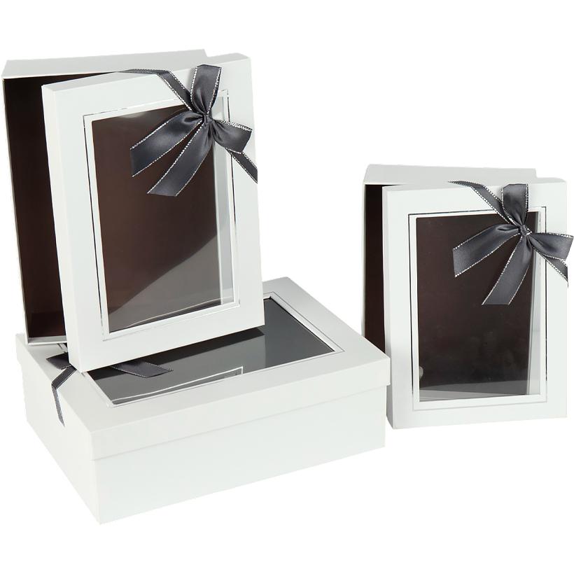 Набір подарункових коробок білих 3 шт. Розміри — 29×21×9,5 см, 25,5×18,5×8 см і 22,5×16,5×6 см. Коробки жорсткої конструкції, вкладаються одна в одну та додатково упаковані в плівку, що зручно для зберігання і транспортування. Оформлені святковою стрічкою з бантом. Кришка оснащена прозорим віконцем із щільної плівки, виконаним у форматі фоторамки, що дозволяє бачити вміст і надає упаковці охайного вигляду. Підходять для подарунків і святкових наборів. Товар вигідний для оптових магазинів і підходить для роздрібного продажу.