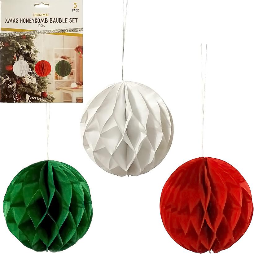 Набір підвісних прикрас Honeycomb “Кулі” містить 3 декоративні елементи діаметром 10 см. У комплект входять кулі білого, червоного та зеленого кольорів, виготовлені з щільного паперу в техніці «соти». До набору також входять скріпки по 2 шт кожного кольору для зручного кріплення. Прикраси легко складаються й розкриваються, створюючи об’ємний ефект. Ідеально підходять для святкового оформлення дому, офісу, вітрин чи заходів, додаючи інтер’єру яскравості та затишку. Упаковка: 17×14 см.