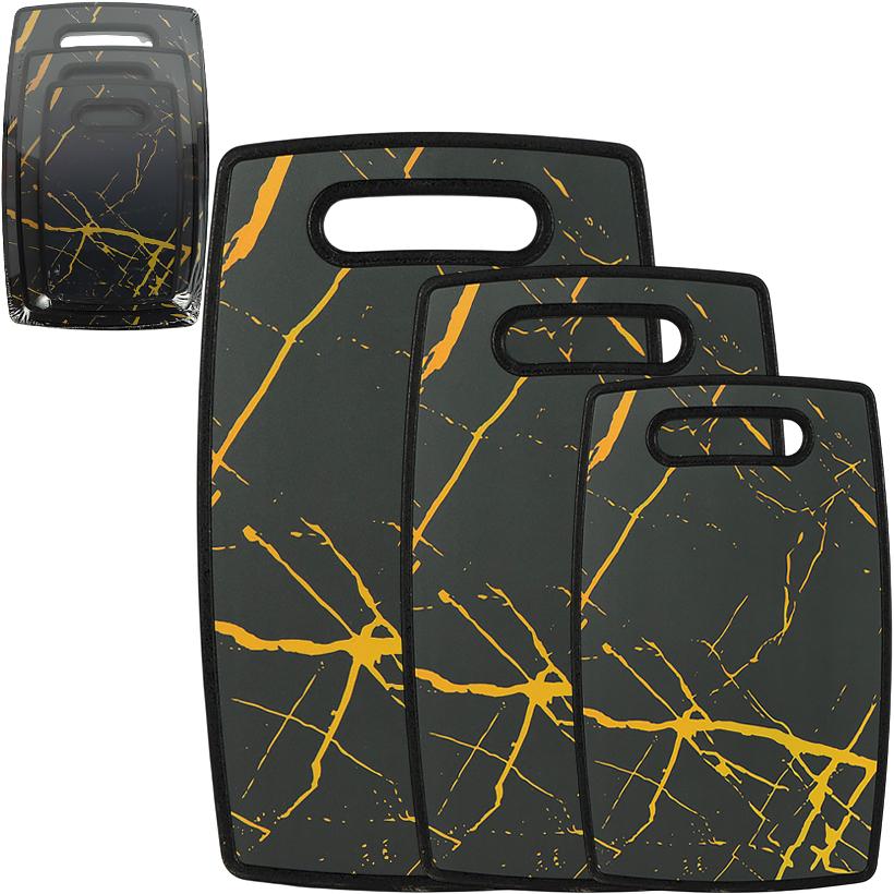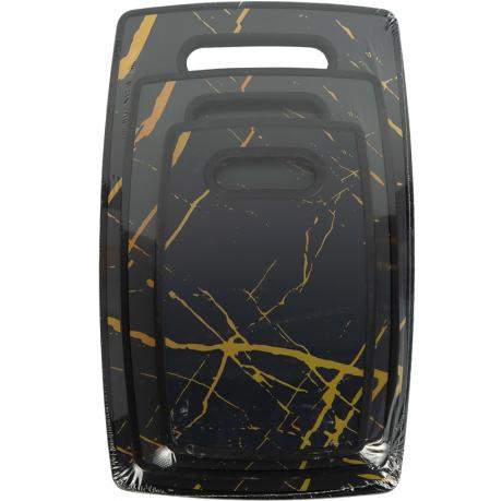 Набір обробних дощок RH-07 з мармуровим візерунком складається з 3 дощок розмірів 24×15×1 см, 19×29×1 см та 22×36×1 см. Набір зручний для різних кухонних процесів і розділення продуктів. Підходить для нарізання овочів, фруктів, м’яса, риби та хліба. Міцна поверхня легко миється, не вбирає запахи та підходить для щоденного використання. Мармуровий дизайн гармонійно доповнює інтер’єр кухні.