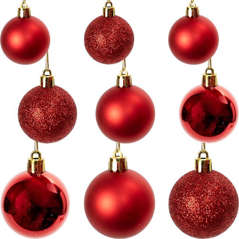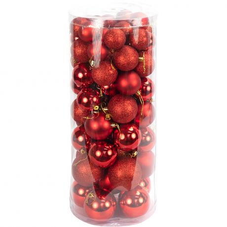 Набір ялинкових прикрас 6279-2R (72 шт.) — класичний комплект у насиченому червоному кольорі, який створює затишну та святкову атмосферу. У наборі: 12 куль діаметром 8 см, 16 куль діаметром 7 см, 20 куль діаметром 6 см та 24 кулі діаметром 5 см. Поверхні різноманітні — матові, глянцеві та з блискітками, що додає оформленню глибини й сяйва. Прикраси виготовлені з міцного, легкого пластику, безпечного для дітей і домашніх тварин. Упаковані у прозорий циліндр діаметром 21 см і висотою 48 см, зручний для зберігання та як подарунковий варіант. Ідеально підходять для декору ялинки, оселі, офісу чи вітрини.