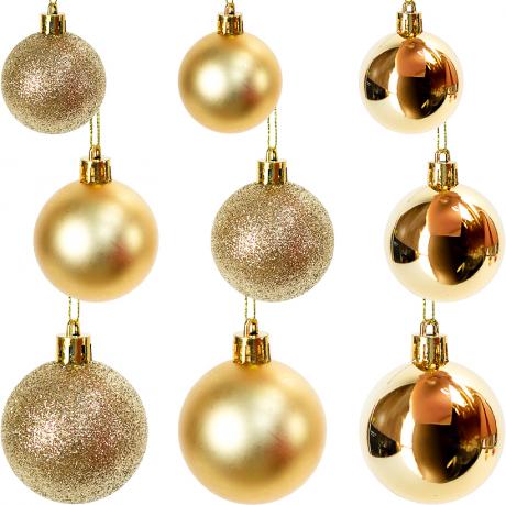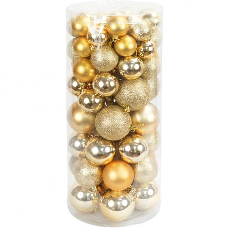 Набір ялинкових прикрас 6279-2G (72 шт.) — вишуканий комплект у благородному золотому кольорі, що надає інтер’єру тепла й святкового сяйва. У наборі: 12 куль діаметром 8 см, 16 куль діаметром 7 см, 20 куль діаметром 6 см та 24 кулі діаметром 5 см. Поверхні різноманітні — матові, глянцеві та з блискітками, що створює ефект глибини та розкоші. Прикраси виготовлені з міцного, легкого пластику, безпечного для дітей і тварин. Упаковані у прозорий циліндр діаметром 21 см і висотою 48 см, зручний для зберігання чи як подарунковий варіант. Ідеально підходять для декору ялинки, оселі, офісу або вітрини.