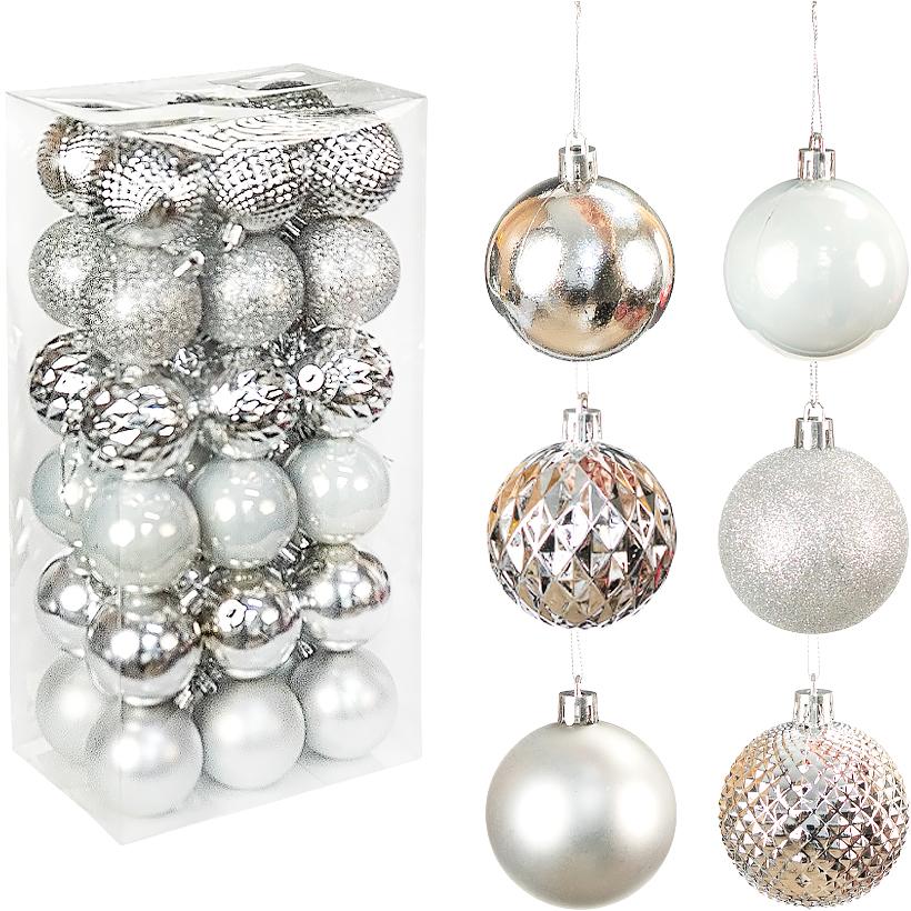 Набір ялинкових куль D6 см (36 шт) — стильний святковий декор для прикрашання новорічної ялинки, вінків та інтер’єру. У комплекті кулі з різними варіантами покриття: матові, глянцеві, блискіткові та рельєфні, що створює цікавий візуальний ефект і додає об’єму композиції. Усі прикраси мають підвіски та готові до використання. Упаковано в прозору коробку розміром 35×17,5×11,5 см, зручно для зберігання та транспортування.