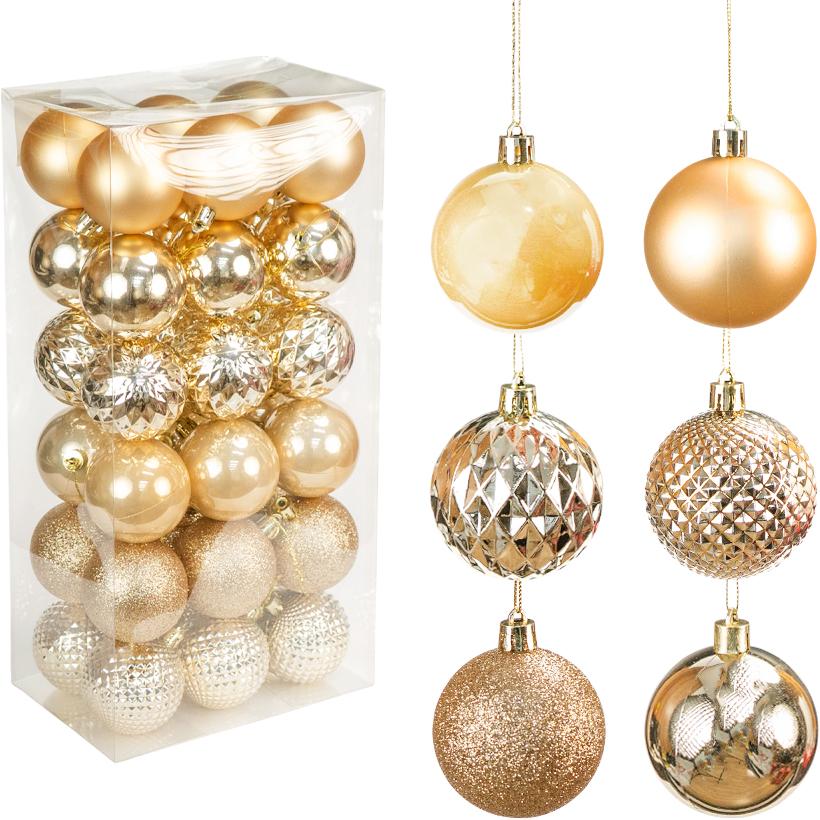Набір ялинкових куль D6 см (36 шт) — стильний святковий декор для прикрашання новорічної ялинки, вінків та інтер’єру. У комплекті кулі з різними варіантами покриття: матові, глянцеві, блискіткові та рельєфні, що створює цікавий візуальний ефект і додає об’єму композиції. Усі прикраси мають підвіски та готові до використання. Упаковано в прозору коробку розміром 35×17,5×11,5 см, зручно для зберігання та транспортування.